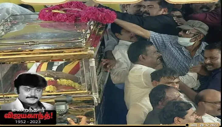அவரது உடல் கோயம்பேடு அருகே உள்ள தேமுதிக அலுவலக்தில் பொதுமக்கள் அஞ்சலிக்காக வைக்கப்பட்டுள்ளது. அங்கு அரசியல் தலைவர்கள், பிரபலங்கள் மற்றும் பொதுமக்கள் அஞ்சலி செலுத்தி வருகின்றனர். இந்நிலையில், பிரபல நகைச்சுவை நடிகர் கவுண்டமனி விஜயகாந்த் உடலுக்கு நேரில் சென்று அஞ்சலி செலுத்தினார்.