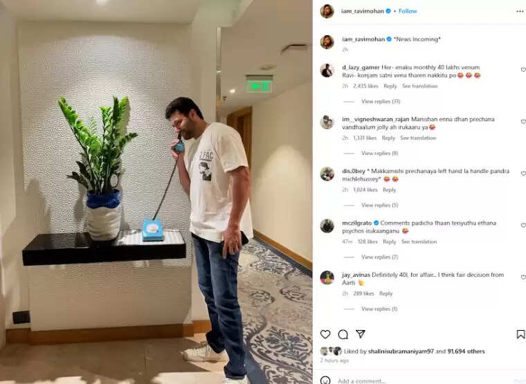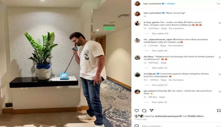 அதேபோன்று, ஜீவனாம்சம் கேட்டு ஆர்த்தி தரப்பில் மனு தாக்கல் செய்யப்பட்டுள்ளது. அதில் ரவி மோகன் மாதம் 40 லட்ச ரூபாய் தர வேண்டும் என அவர் கோரிக்கை விடுத்துள்ளார். இந்நிலையில் வழக்கின் விசாரணையை அடுத்த மாதம் 12ஆம் தேதிக்கு சென்னை 3வது கூடுதல் குடும்ப நல நீதிமன்ற நீதிபதி தேன்மொழி ஒத்திவைத்தார்.இந்நிலையில், ரவி மோகன் தனது இன்ஸ்டாகிராம் பக்கத்தில், "NEWS INCOMING" என்ற வாசகத்துடன் தொலைபேசியில் பேசுவதை போன்ற புகைப்படத்தை பதிவிட்டுள்ளார்.