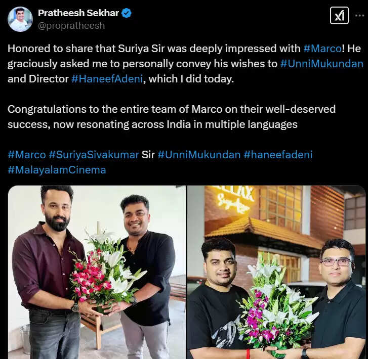 மலையாளத்தில் வெளியான ‘மார்கோ’ திரைப்படம் இந்தியளவில் மாபெரும் வரவேற்பைப் பெற்றது. இந்நிலையில், இப்படத்தை பார்த்துவிட்டு திரையுலகினர் பலரும் படக்குழுவினருக்கு வாழ்த்து தெரிவித்தார்கள். தற்போது சூர்யாவும் படம்பார்த்துவிட்டு படக்குழுவினருக்கு வாழ்த்து தெரிவித்துள்ளார். அதன் நாயகன் உன்னி முகந்தன் மற்றும் ஹனிஃப் அடினி ஆகியோருக்கு பூங்கொத்து அனுப்பி தனது வாழ்த்தை பகிர்ந்திருக்கிறார்.