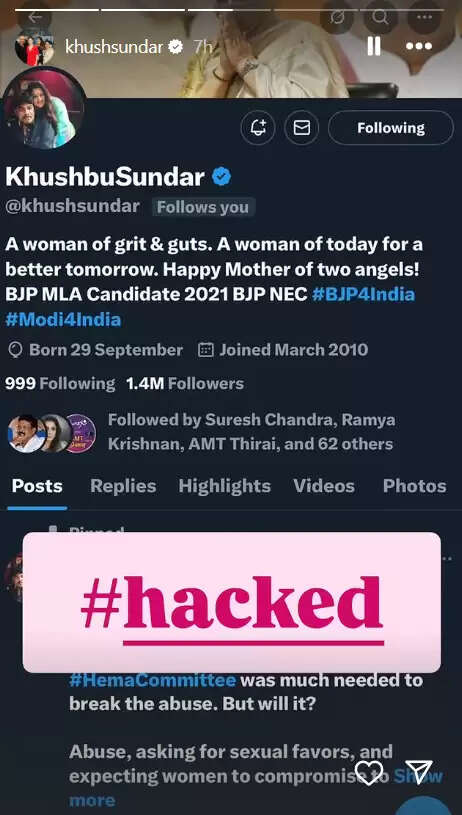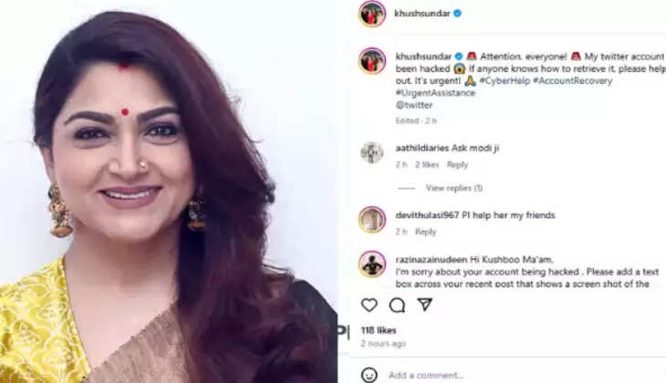 நடிகையும் பா.ஜ., பிரமுகருமான குஷ்புவின் எக்ஸ் தள பக்கம் ஹேக் செய்யப்பட்டுள்ளதாக தனது இன்ஸ்டா பக்கத்தில் பதிவிட்டுள்ளார்.