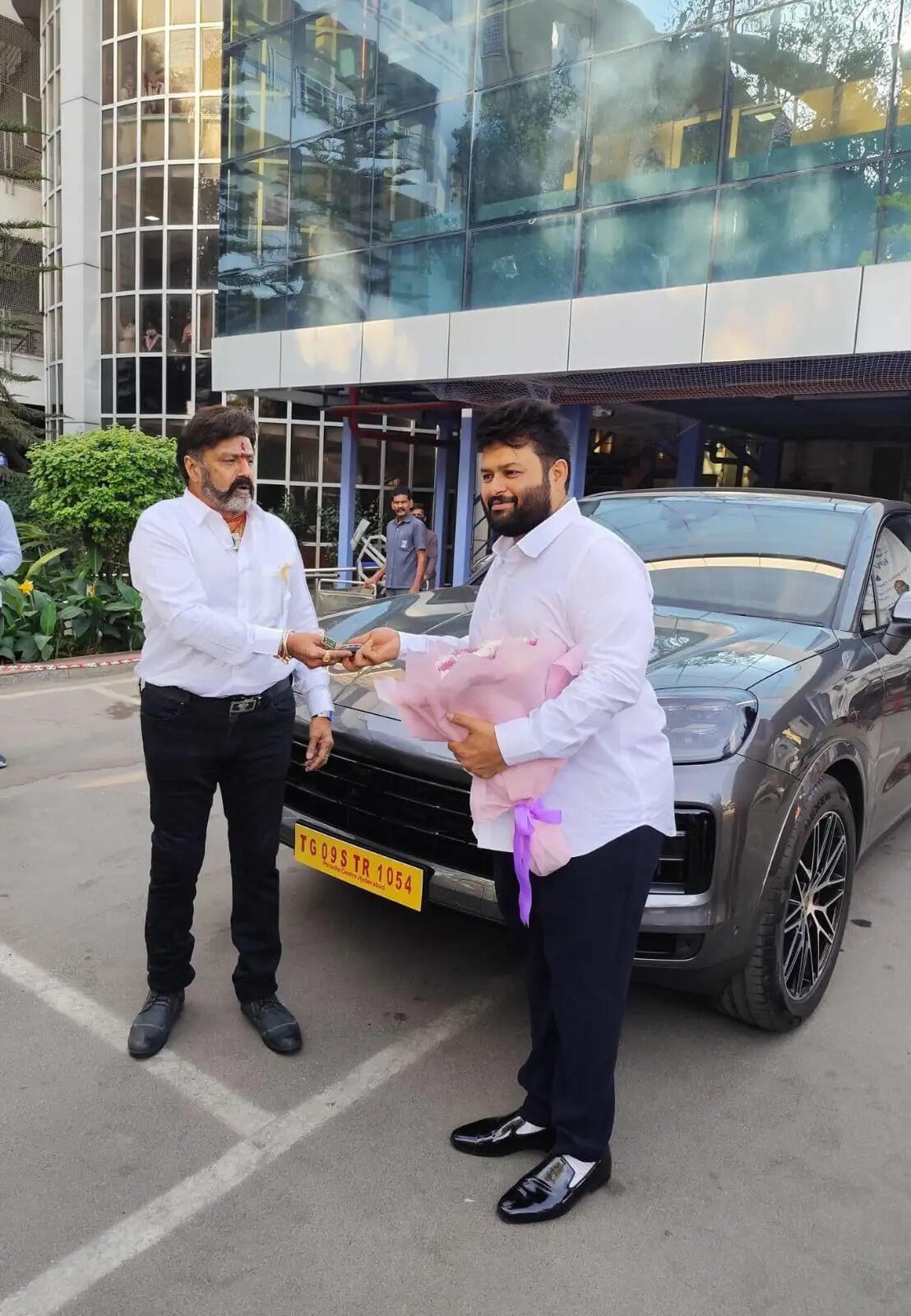 நடிகர் பாலகிருஷ்ணா இசையமைப்பாளர் தமனுக்கு விலையுயர்ந்த போர்ஸ் காரை பரிசாக வழங்கியுள்ளார்.