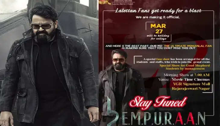 நடிகர் பிருத்விராஜ் இயக்கத்தில் மோகன்லால் நடித்துள்ள ‘எம்புரான்’ படத்தின் வெளியீட்டை முன்னிட்டு பெங்களூரில் தனியார் கல்லூரி மார்ச் 27ஆம் தேதியை அதிகாரப்பூர்வ விடுமுறை நாளாக அறிவித்துள்ளது.