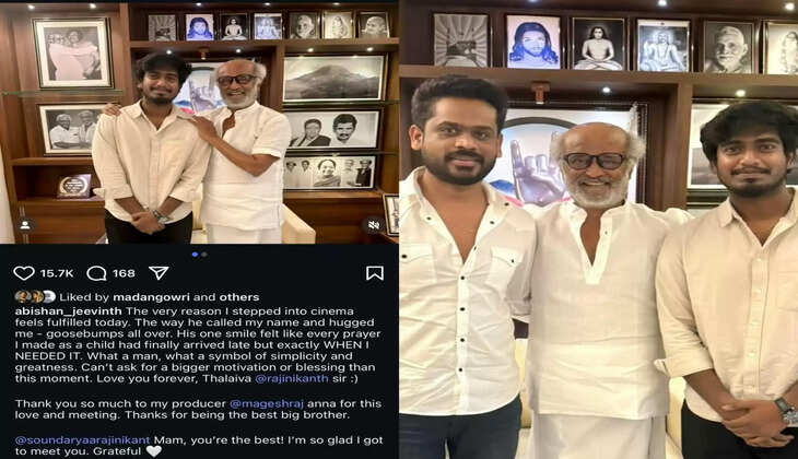 இந்த நிலையில் ‘டூரிஸ் ஃபேமிலி’படத்தை இயக்கிய அபிஷன் ஜீவிந்தை, நடிகர் ரஜினிகாந்த் நேரில் அழைத்து பாராட்டியிருக்கிறார். இதுகுறித்து எக்ஸ் தளத்தில் பதிவிட்டுள்ள அவர், “நான் சினிமாவில் காலடி எடுத்து வைப்பதற்கான காரணம் இன்று முழுமை அடைந்திருக்கிறது. அவர் என்னுடைய பெயரை அழைத்த விதமும், கட்டியணைத்ததும் புல்லரிக்க வைத்தது.