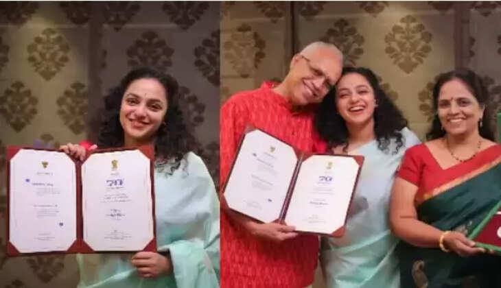 70-வது தேசிய திரைப்பட விருது வழங்கும் விழா அண்மையில் டெல்லியில் உள்ள விக்யான் பவனில் நடைப்பெற்றது. விருது வாங்கும் பல்வேறு திரைப்பிரபலங்கள் இவ்விழாவில் கலந்துக் கொண்டனர். பொன்னியின் செல்வன் திரைப்படத்திற்கு 4 தேசிய விருதுகள் வழங்கப்பட்டுள்ளது. மணிரத்னம், லைகாவின் சுபாஸ்கரன், ஏ.ஆர் ரஹ்மான் பொன்னியின் செல்வன் திரைப்படத்திற்கான விருதை பெற்றுக் கொண்டனர். சிறந்த நடிகைக்கான விருதை திருச்சிற்றம்பலம் திரைப்படத்திற்காக நடிகை நித்யா மேனன் விருதை பெற்றுக் கொண்டார். விருது வாங்கிய மகிழ்ச்சியை அவரது பெற்றோருடன் பகிர்ந்துக் கொண்டார். அப்பொழுது நித்யா மேனன் தன் பெற்றொருடன் இணைந்து புகைப்படம் எடுத்து கொண்டாடியுள்ளார். அந்த புகைப்படத்தை அவரது சமூக வலைத்தள பக்கத்தில் வெளியிட்டார்.