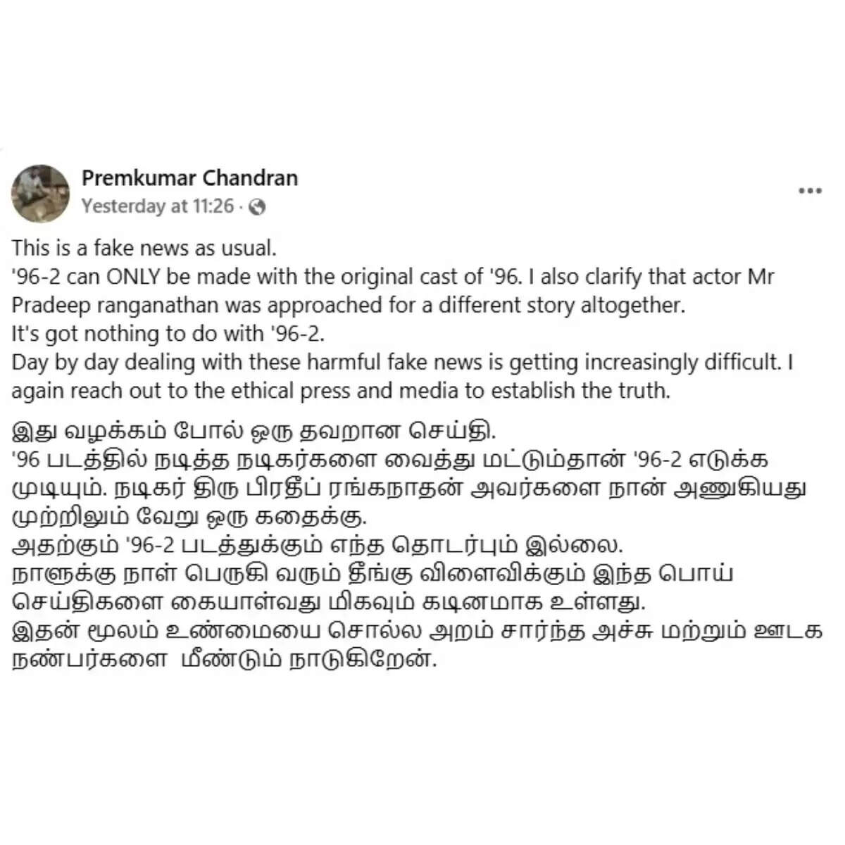 இதற்கு மறுப்பு தெரிவித்து பதிவு ஒன்றை வெளியிட்டுள்ளார் இயக்குநர் பிரேம் குமார். அதில், “இது வழக்கம் போல் ஒரு தவறான செய்தி. '96’ படத்தில் நடித்த நடிகர்களை வைத்து மட்டும்தான் '96’ 2 எடுக்க முடியும். நடிகர் பிரதீப் ரங்கநாதனை நான் அணுகியது முற்றிலும் வேறு ஒரு கதைக்கு. அதற்கும் '96 பார்ட் 2 படத்துக்கும் எந்த தொடர்பும் இல்லை.
