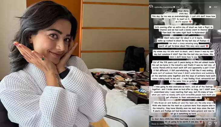 அது மிகப்பெரியதாக இருந்தது..அது போல் உணர்ந்தேன் அது முடிவடைந்து கொண்டிருந்தது.. எனக்கும் புரியாத ஒருவிதமான சோகம், திடீரென்று எல்லா உணர்ச்சிகளும் ஒன்றாகி, தீவிர உழைப்பின் நாட்கள் மீண்டும் என்னைத் தேடி வந்தன.. நான் சோர்வாகவும் உணர்ந்தேன், ஆனால் அதே நேரத்தில் நன்றியுள்ளவர்கள். நான் எல்லாரையும் ரொம்ப மிஸ் பண்ணப் போறேன்.. எல்லா உணர்வுகளையும் ஒருசேர விட்டுட்டு.. ரொம்ப நாளுக்குப் பிறகு நான் ரொம்ப மோசமா உடைஞ்சு போயிட்டேன்..ஆனா நான் ஏன் அப்படி ரியாக்ட் பண்றேன்னு கூட புரியல.. ஆனா எப்பொழுது என்ற பைத்தியக்காரத்தனம். அத்தகைய நம்பமுடியாத நபர்களுடன் நீங்கள் எவ்வளவு நெருக்கமாக பணியாற்றுகிறீர்கள்? அல்லு அர்ஜுன் சார் மற்றும் சுக்கு சார் மற்றும் டீம் மட்டும் தான் என்னை இண்டஸ்ட்ரியில் அதிகம் தெரிந்தவர்கள் என்று நினைக்கிறேன்.. கடந்த 5 வருடங்களாக என்னை அதிகம் பார்த்தவர்கள் புஷ்பா செட் தான். சொந்த மைதானம் மற்றும் இப்போது விடுவது மிகவும் கடினமான ஒன்று. எனவே டியர் டைரி 25 நவம்பர் 2024 மிகவும் கடினமான நாளாக இருந்தது, ஆனால் அது ஒரு நாள் மதிப்புக்குரியதாக இருக்கும் என்று நம்புகிறேன்.இவ்வாறு அதில் தெரிவித்துள்ளார்.