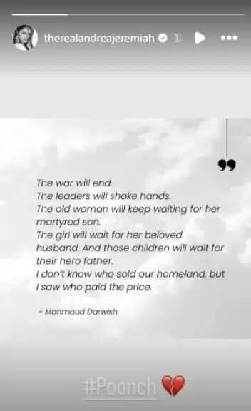 “போர் முடிவுக்கு வரும். தலைவர்கள் கைகுலுக்கிக் கொள்வார்கள். அந்த மூதாட்டி தனது இறந்து போன மகனுக்காகக் காத்திருப்பாள். அந்தப் பெண் தனது அன்பான கணவருக்காகக் காத்திருப்பாள். அந்தக் குழந்தைகள் தங்கள் ஹீரோ தந்தைக்காகக் காத்திருப்பார்கள். நமது தாயகத்தை யார் விற்றார்கள் என்று எனக்குத் தெரியாது. ஆனால் அதற்கான விலையை யார் கொடுத்தார்கள் என்பதை நான் கண்டேன்” என்ற பாலஸ்தீன கவிஞர் மஹ்மூத் தர்விஷ் எழுதிய கவிதையை ஆண்ட்ரியா தனது இன்ஸ்டாகிராம் ஸ்டோரியில் இடம்பெற செய்துள்ளார்.