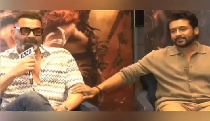 அந்த வகையில் மும்பை, டெல்லி என படக்குழு தொடர்ந்து நிறைய ஊடகங்களுக்கு பேட்டி கொடுத்து வருகின்றனர். அதில் சமீபத்திய பேட்டி ஒன்றில் சூர்யா, ஒரு தருணத்தில் எமோஷ்னலாக காணப்பட்டார். அதில் பாபி தியோல் மற்றும் சூர்யா இருவரும் பேசிக்கொண்டிருந்தனர். அப்போது பாபி தியோல் குறித்து பேசிய, சூர்யா, “பாபி தியோல் முன்பு நிற்பதற்கு என்னுடைய முழு தைரியத்தையும் நம்பிக்கையும் கொண்டு வருவேன். அவருடைய உடல் கட்டமைப்பு அவ்வளவு வலிமையாக இருக்கும். அவருடன் உடல் ரீதியாக போட்டி போட முடியாது” என்றார். பின்பு பேசிய பாபி தியோல், “சூர்யா போன்று பண்புள்ள நடிகர்கள், உயரமாக இருக்கத் தேவையில்லை. அவர் மற்றவர்களை விட உயர்ந்து நிற்கிறார். அவருடைய நடிப்பு என்னை மிரட்டியது” என்றார். அப்போது எமோஷ்னலான சூர்யா, பாபி தியோலை கையை தொட்டு தனது அன்பை வெளிப்படுத்தினார்.